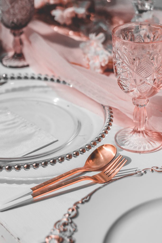 Links to rent the decor: Table Runners Rose Gold Flatware  |  Blush Stemware  |  Charger Plates