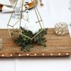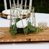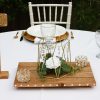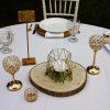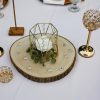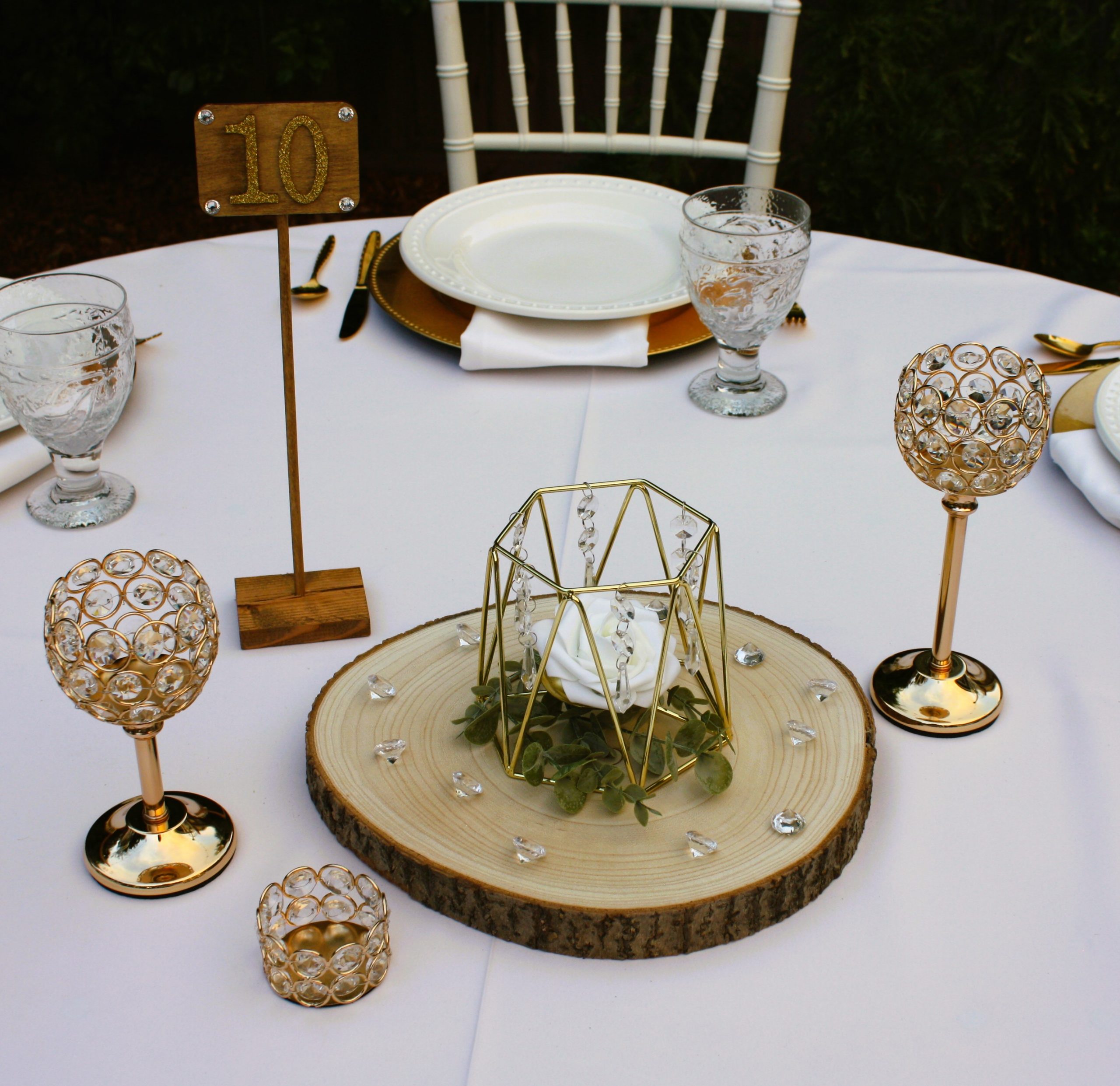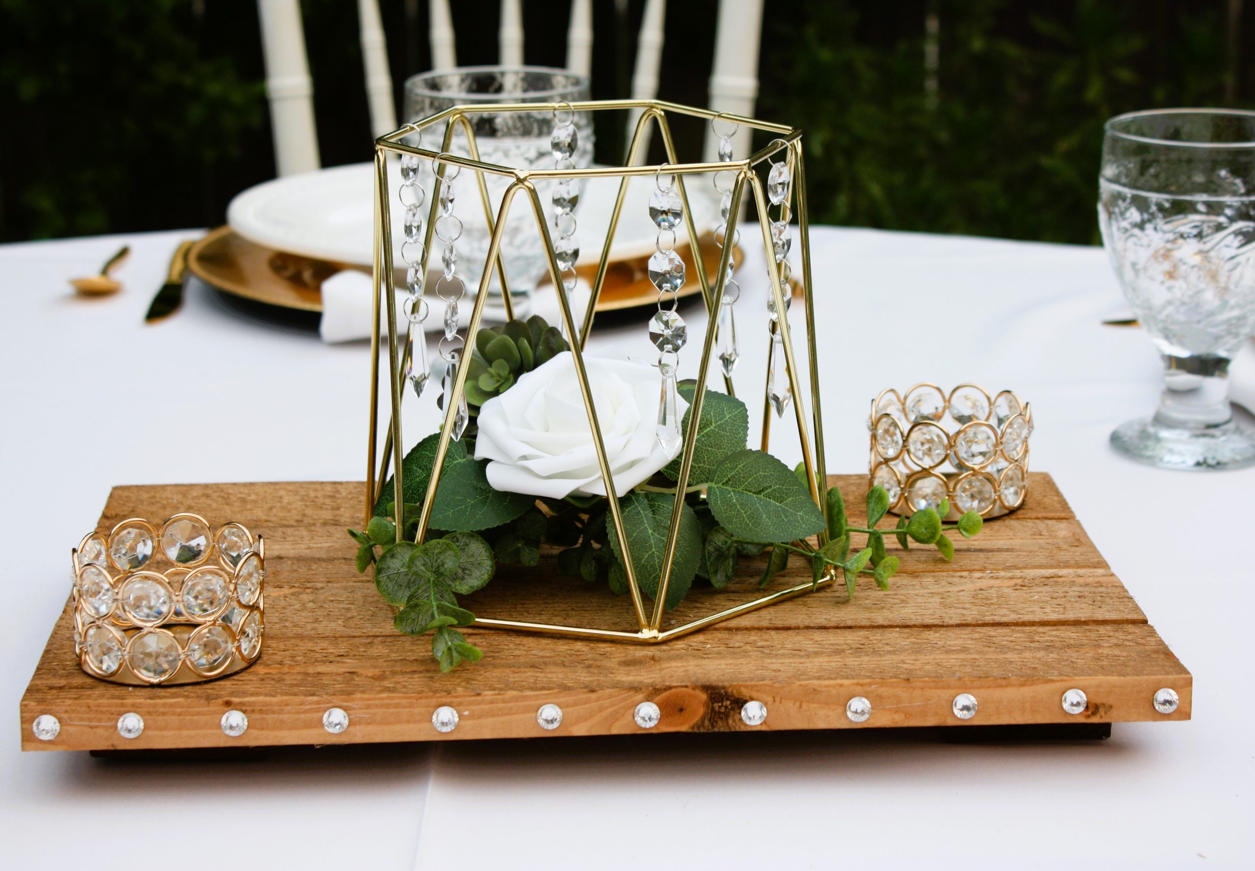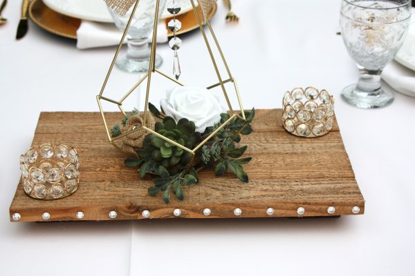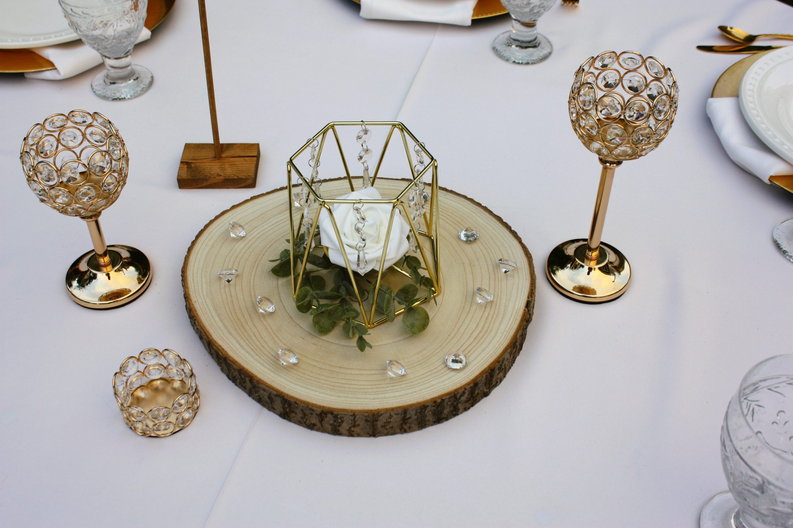 Style 3 features: smaller metal geometric shape measuring 4.73″tall x 5.71″wide; wood round slice measures between 11 and 13 inches; crystal diamond gem scatter, and gold and crystal votive holders (white votives included): small round votive holder plus a 12 and 14 inch tall votive holder. Faux flowers: white rose with dusted eucalyptus leaves