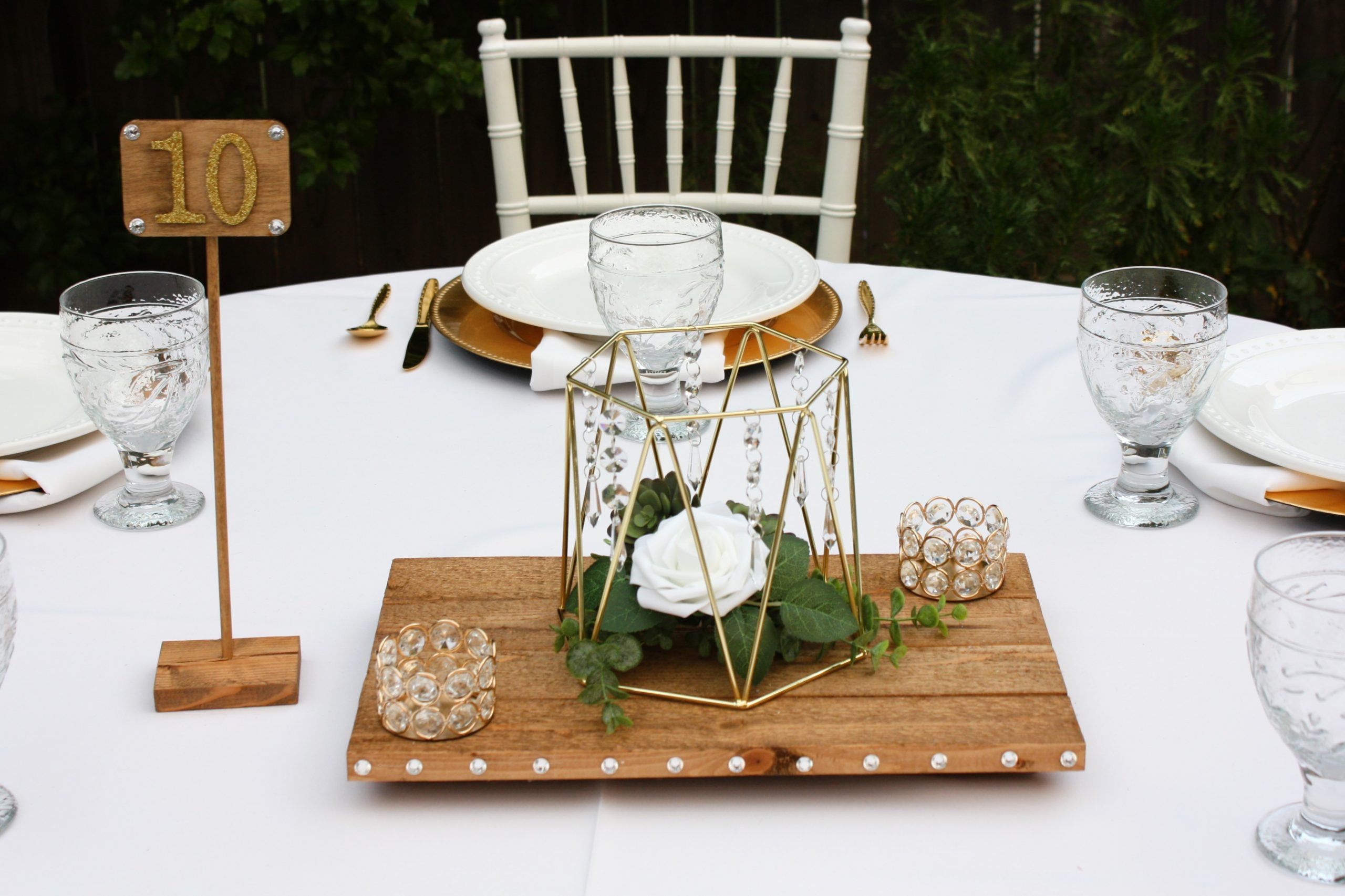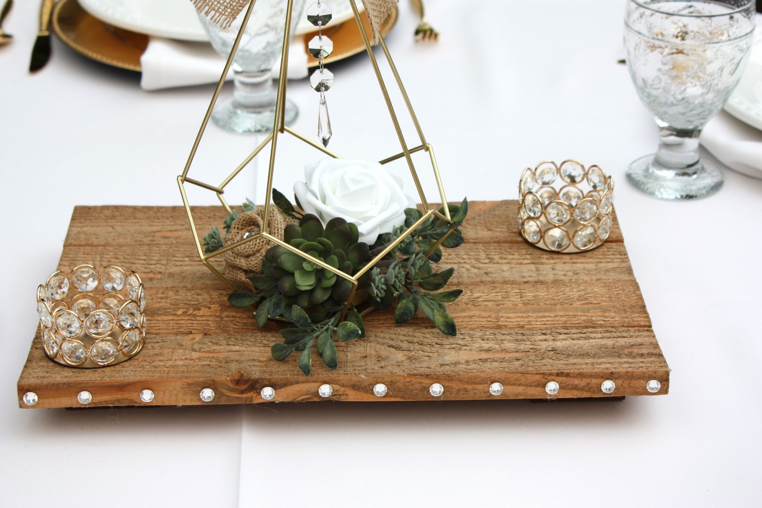 Style 1 features: metal geometric shape measuring 6.3″tall x 7.8″wide; a four plank style wood base stained in special walnut and embellished with rhinestones on both the front and back; includes 2 small gold and crystal votive holders (white votives included); wood table number sign is stained to match and features gold glitter wooden numbers and rhinestones. Faux flowers: white rose and leaves, green eucalyptus leaves, and 2 green rosette succulents