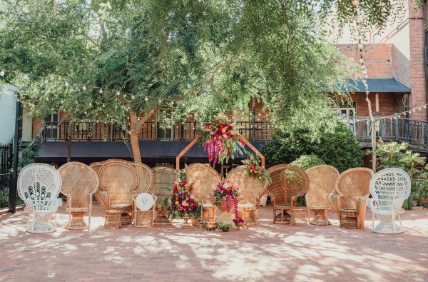 White Elephant Co. Event Rentals – “Chi’s Classic” Peacock Chair. Large vintage peacock chair with fan back and ornate black and beige pattern. Contact us for more available vintage furniture and decor!
