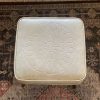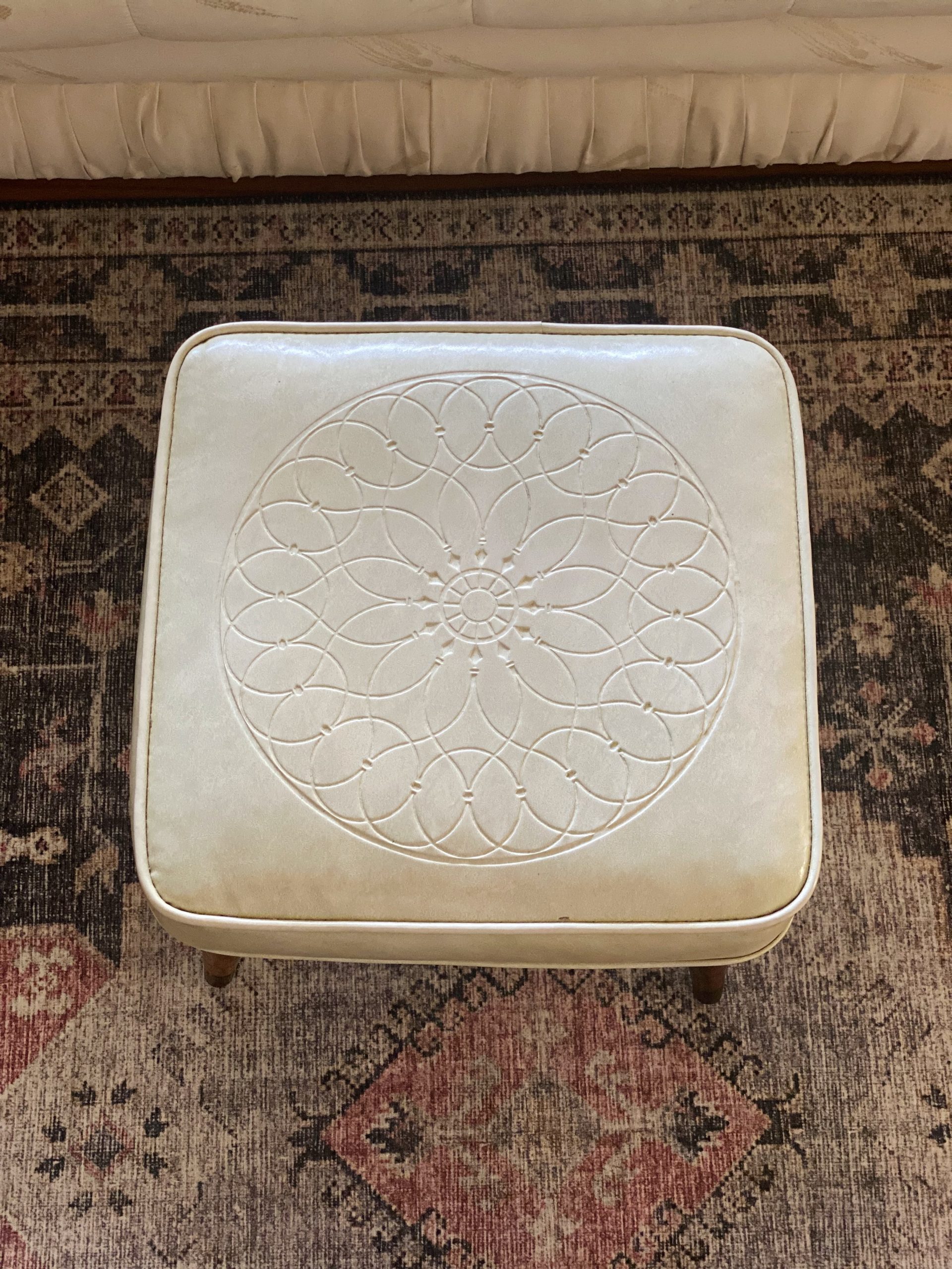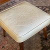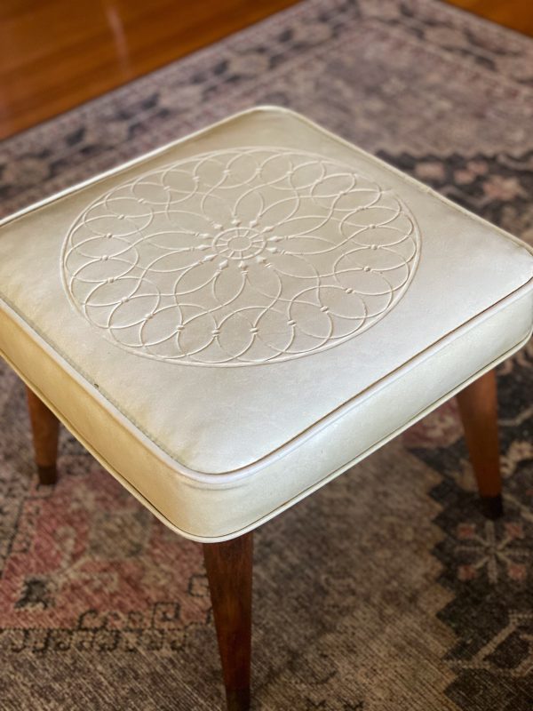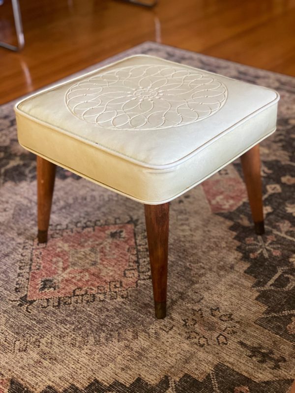 Mid century modern wooden stool available for rent. Off-white vinyl top with beautiful embedded design. Classic walnut lets and gold metal feet. Sturdy and sits evenly. A lovely vintage rental for any event or occasion. Contact us for more available vintage furniture and decor!