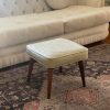 Mid century modern wooden stool available for rent. Off-white vinyl top with beautiful embedded design. Classic walnut lets and gold metal feet. Sturdy and sits evenly. A lovely vintage rental for any event or occasion. Contact us for more available vintage furniture!