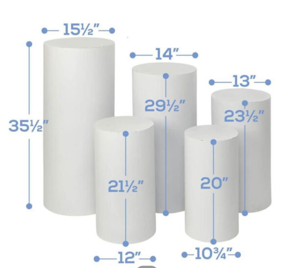 This set comes with 5 pedestals. Dimensions are 35 1/2′ x 15 1/2′, 29 1/2′ x 14′, 23 1/2’x 13′, 21 1/2 x12′, 20′ x 10 3/4′ .