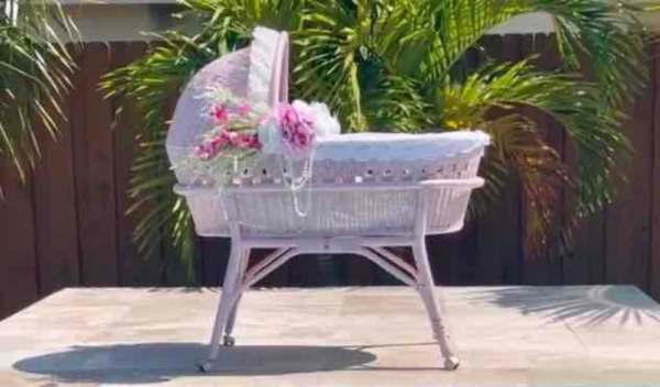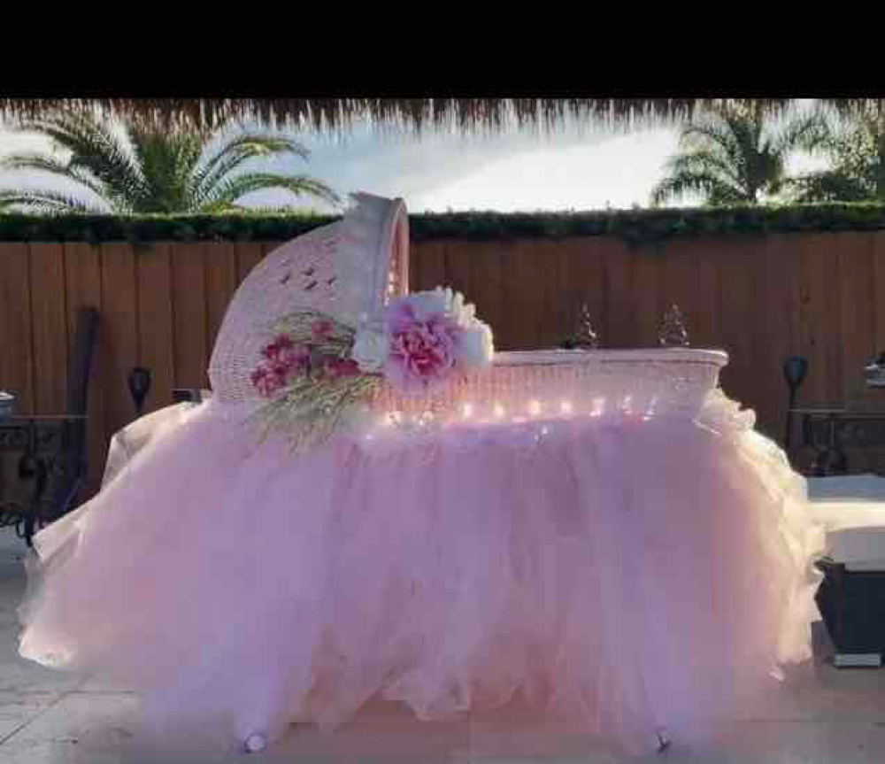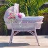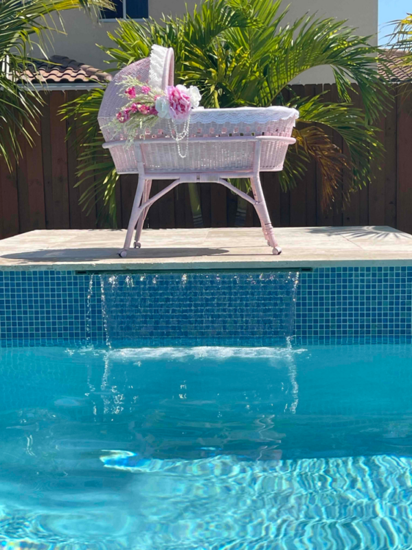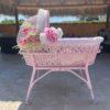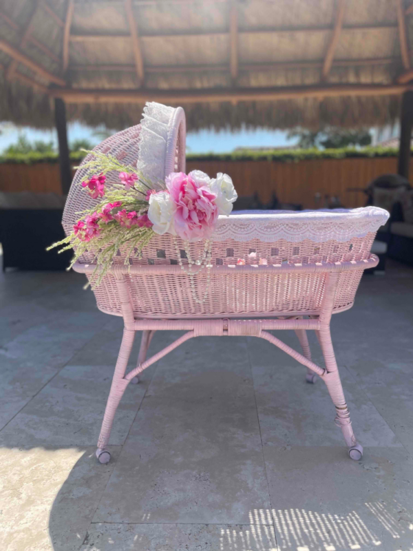 Beautiful full size vintage wicker baby bassinet rental in pink. Available with or without skirt. Price includes delivery and pick up in Miami Metro Area only. Extra charge for Broward delivery